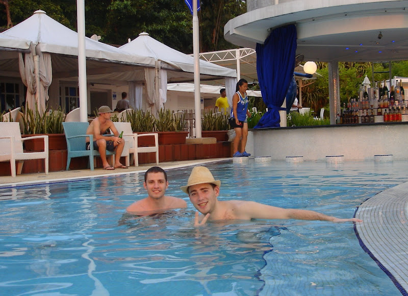 L'image qui suit n'a que pour but de faire chier les gens qui on froid a Bordeaux, et qui n'en peuvent plus d'attendre que l'été arrive, voila la piscine du bar ou nous nous somme désaltéré après un beach foot ball intense avec la population locale (et un claquage aux adducteurs, super .... ) sur l'ile de sentosa. Petit détail : en temps normal j'aurai préféré l'eau turquoise de la mer, mais ici, elle est simplement dégueulasse .... hé oui Singapour c'est tout de même un (le ?) des plus grands ports du monde...